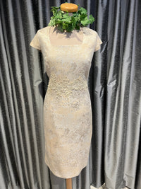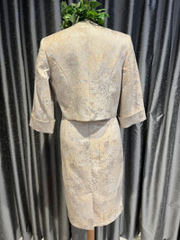 An elegant jacquard sheath dress with a floral lace waist, paired with a matching cropped jacket. A sophisticated two-piece set perfect for weddings or formal occasions.