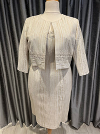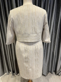This dress features intricate gold detailing and delicate lace on the bodice. Complete your elegant look with the matching jacket. Indulge in timeless style with this stunning dress.