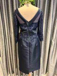 This Navy satin dress features intricate lace detailing on the bodice, along with a pleated waistband and scoop neckline. Perfect for any special occasion, this dress will make you feel confident and elegant.
