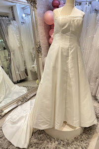 This A-line strapless satin gown is the epitome of refined bridal style. Crafted from luxurious satin, the dress drapes effortlessly over the body, creating a flattering and feminine silhouette.