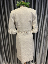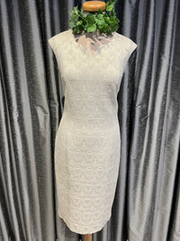 A beautifully textured dress designed with a flattering fitted silhouette. Featuring soft puffed, cuffed sleeves and a delicate embellished waist detail, it offers elegant structure with a feminine finish - perfect for special occasions and timeless styling.